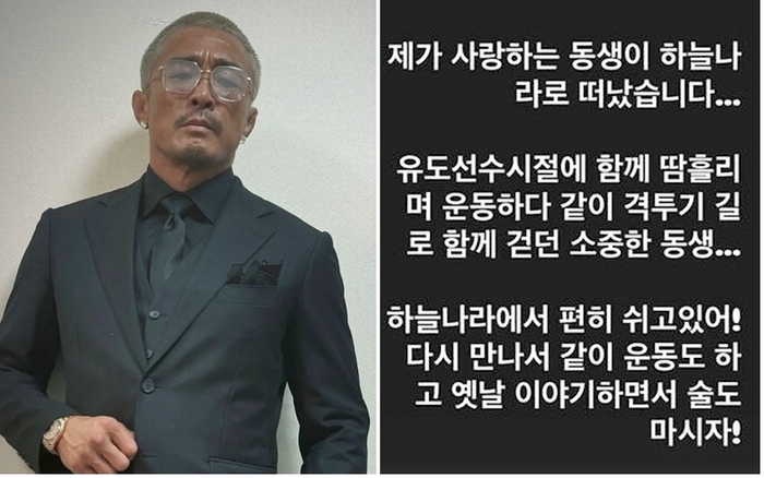 추성훈은 “제가 사랑하는 동생이 하늘나라로 떠났다”며, 유도 선수 시절 함께 땀 흘리며 운동하고, 이후 격투기 길을 함께 걸었던 소중한 동생이라고 고인을 소개했습니다. 이어 “하늘나라에서 편히 쉬고 있어. 다시 만나서 같이 운동도 하고 옛날 이야기 하면서 술도 마시자”고 마지막 인사를 전해, 깊은 애도의 뜻을 나타냈습니다 .
