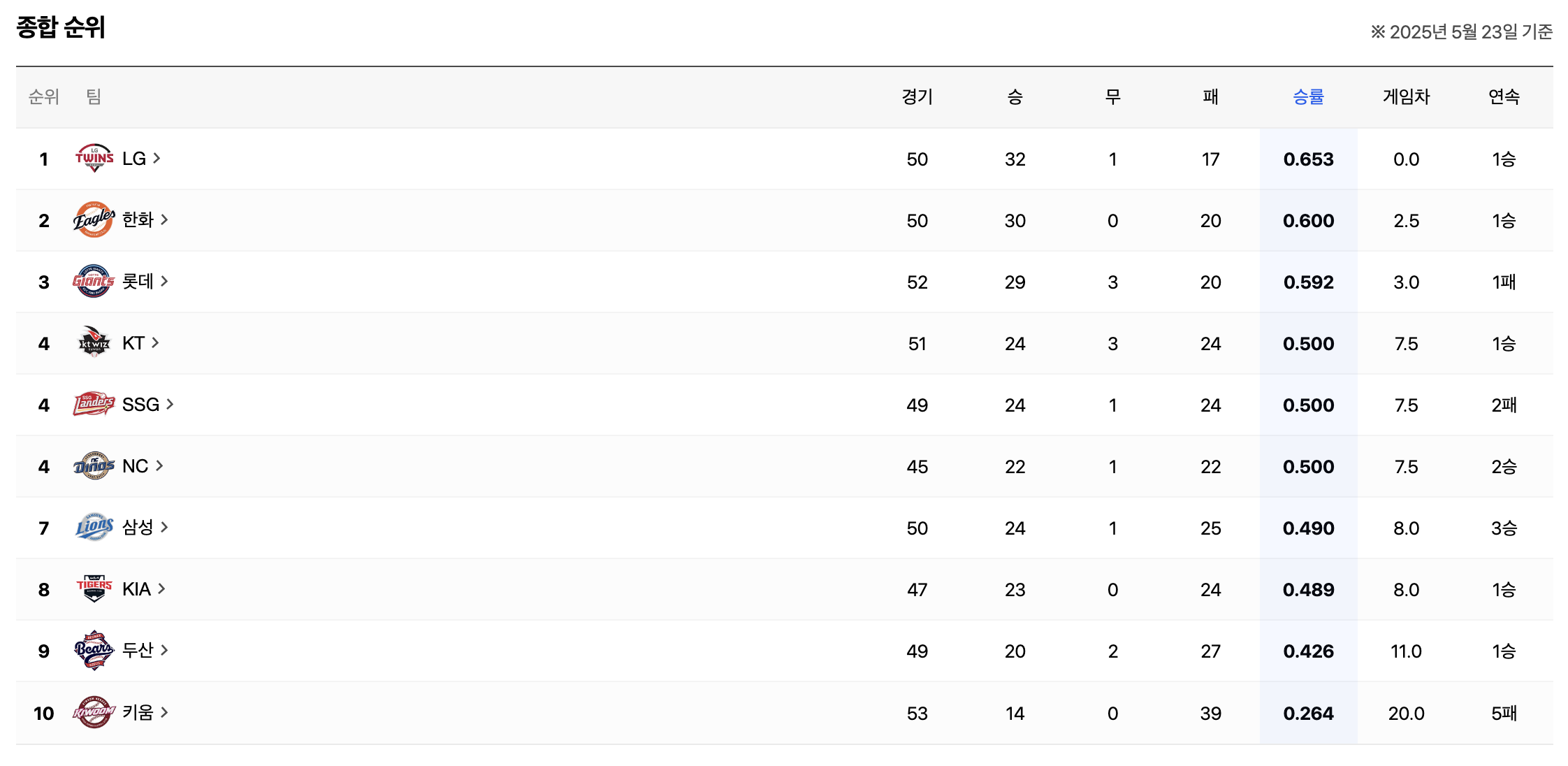 한화 이글스는 5월 23일 롯데 자이언츠와의 경기에서 4-2로 승리하며 단독 2위 자리를 탈환했습니다 . 이날 경기로 한화는 홈 19경기 연속 매진이라는 KBO 신기록을 이어갔습니다.