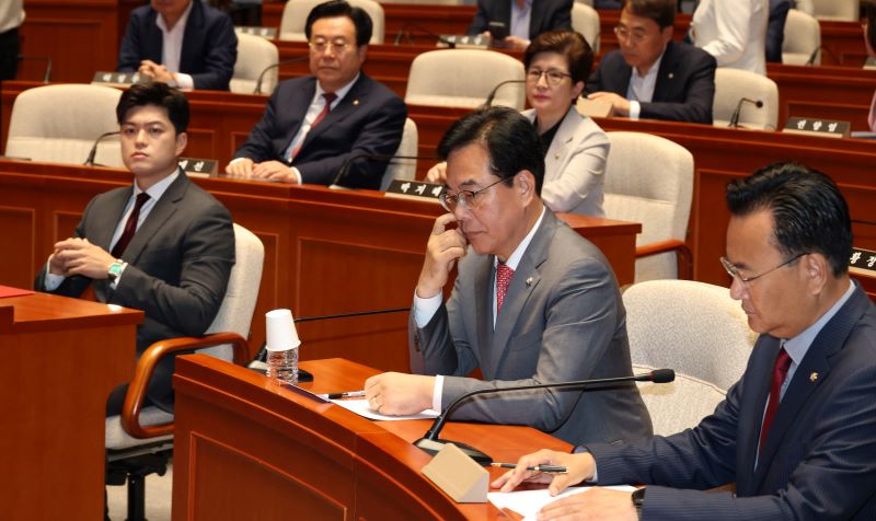 한눈에 보는 오늘 : 정치 - 뉴스 : 김용태 국민의힘 비상대책위원장과 송언석 원내대표가 지난 19일 오전 서울 여의도 국회에서 열린 비리백화점 이재명 정부 인사청문회 대책회의에 참석하고 있